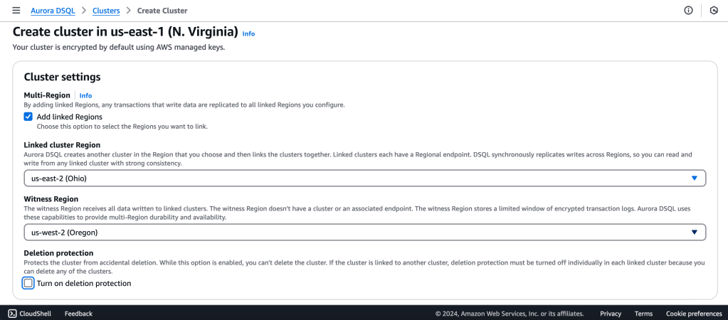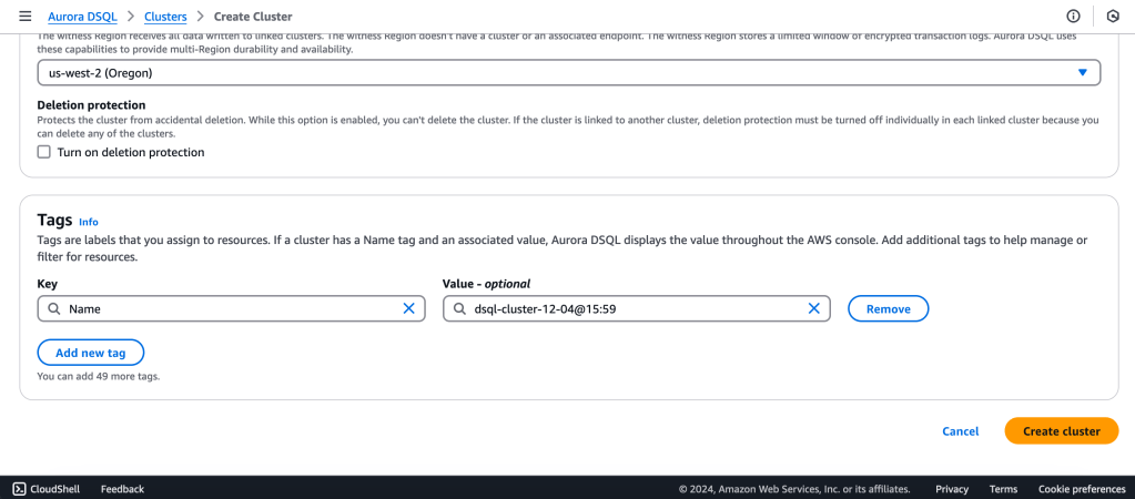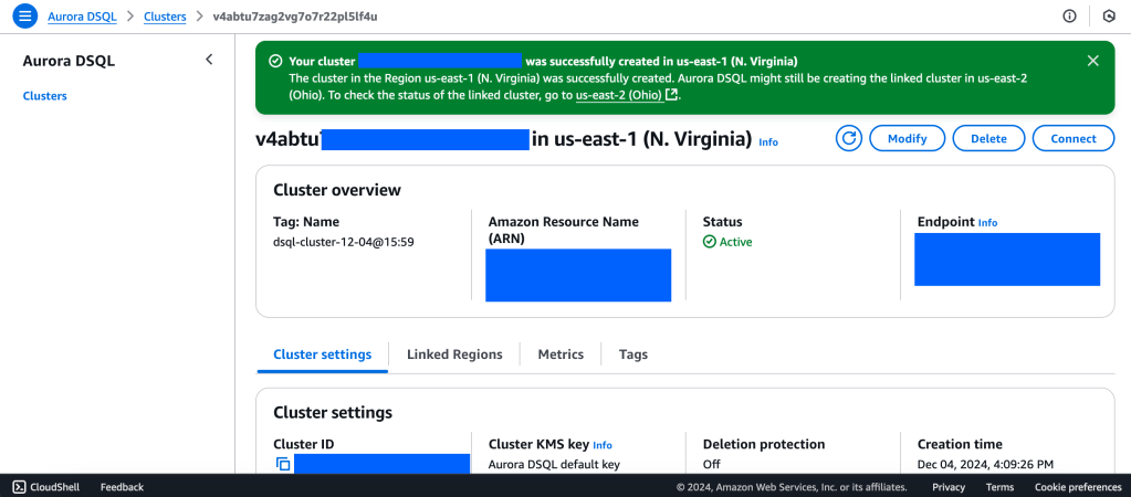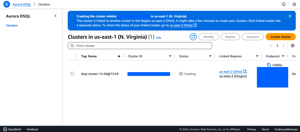[2] Aurora DSQL User Guide : https://docs.aws.amazon.com/aurora-dsql/latest/userguide/getting-started.html#getting-started-create-cluster