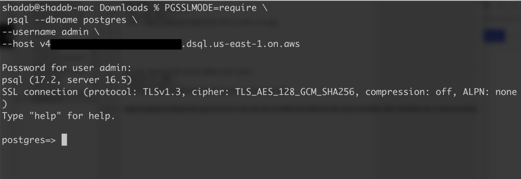 v4********4u.dsql.us-east-1.on.aws/?Action=DbConnectAdmin&X-Amz-Algorithm=AWS4-HMAC-SHA256&X-Amz-Credential=AK*****04%2Fus-east-1%2Fdsql%2Faws4_request&X-Amz-Date=202**X-Amz-Expires=3600&X-Amz-SignedHeaders=host&X-Amz-Signature=41e15*****ddfc49